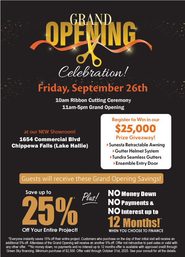 Open House Limited time offers and savings at Asher Lasting Exteriors Save the Date for our Grand Opening! Map to Chippewa Falls Showroom