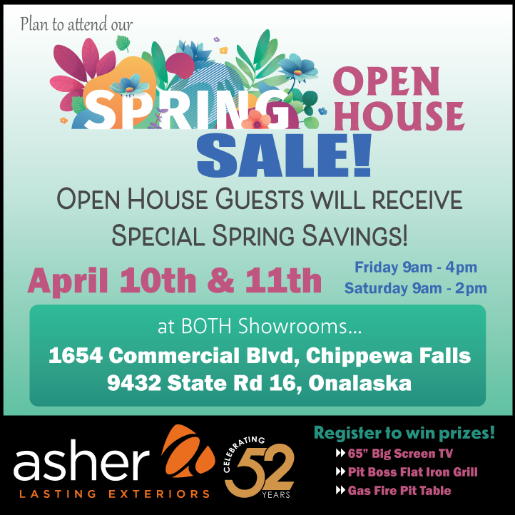 Open House Limited time offers and savings at Asher Lasting Exteriors Save the Date for the Spring Open House! Map to Chippewa Falls Showroom Map to Onalaska Showroom